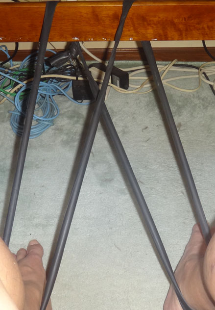 パンクしたチューブを足首に巻いて、パソコンしながら引っ張ってます。