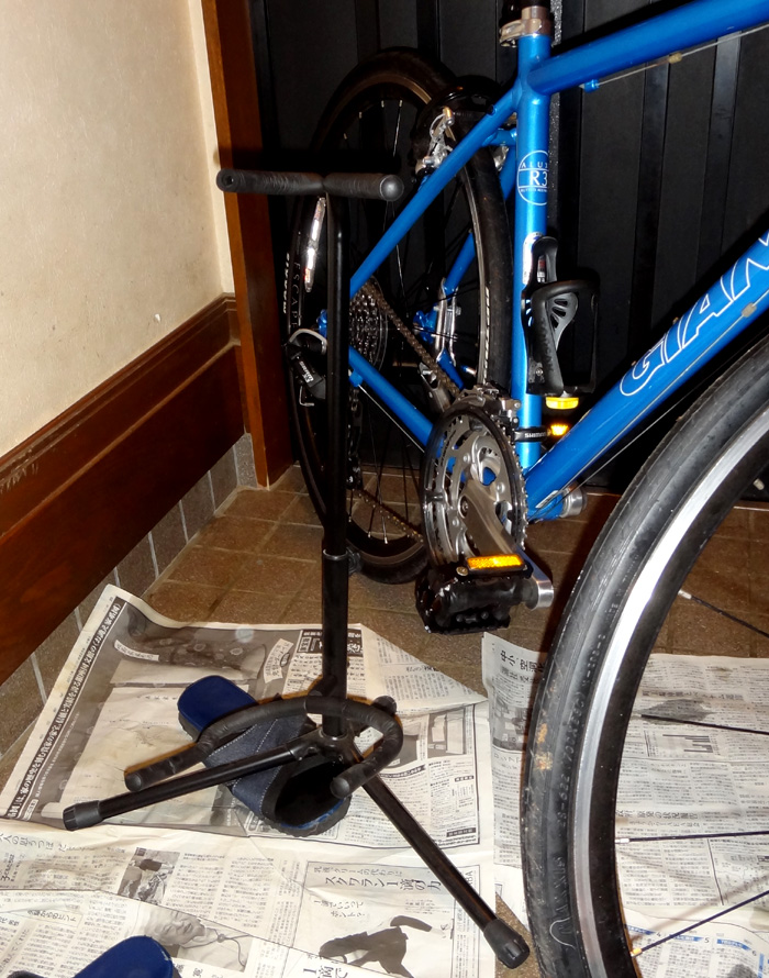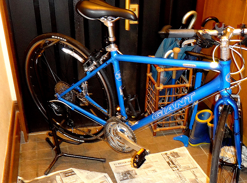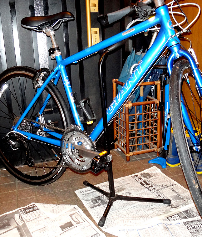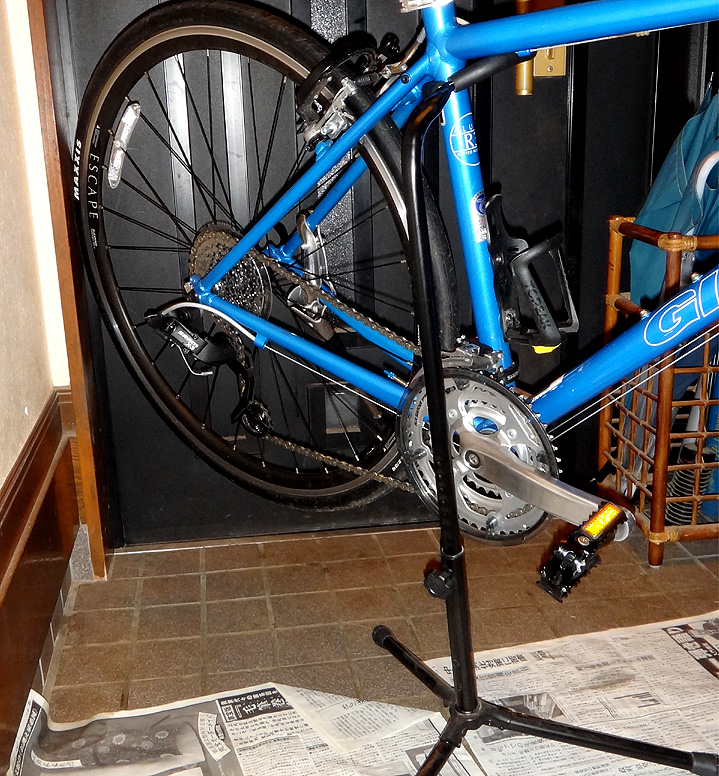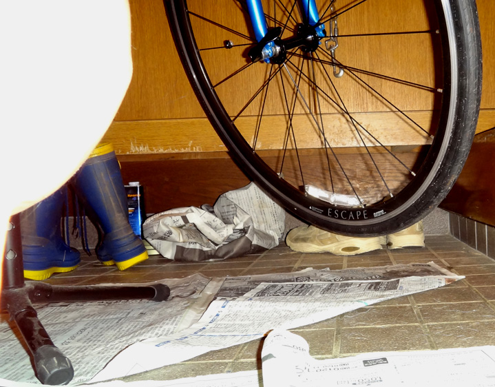 当然のように余っていたので、そのスタンドと自転車を玄関に入れてみた。 もしかして無加工でOK!? 前輪と後輪を個々に乗せてみると、10度ほど起こして、尚且つ斜めに15度ほどの角度を保てばピッタリと乗せられる事が判明。 そんなもん、オリャ〜!っとプライヤとレンチで強制。